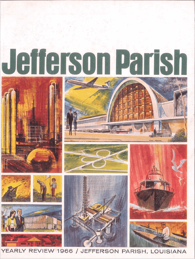In summary, the 1966 Jefferson Parish Yearly Review presents a view of a growing and dynamic community, with a mix of economic activities, infrastructure development, and a focus on attracting residents and visitors.