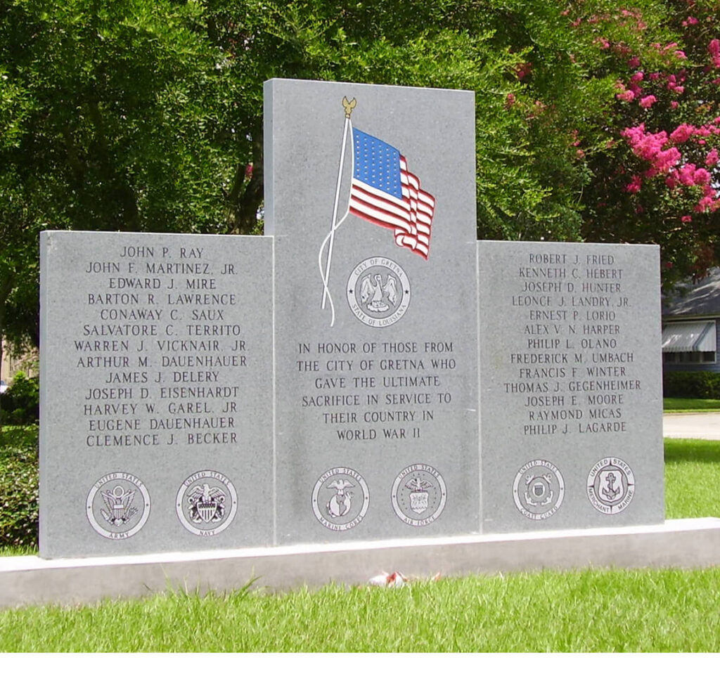 - Content: The most significant detail is that the names of Gretna citizens who died while serving in World War II are inscribed on the granite wall. This personalizes the memorial, turning it into a direct recognition of individual sacrifices.