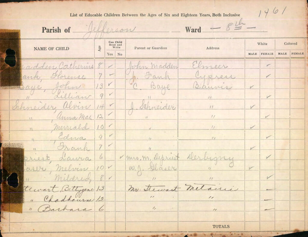 Suburban Acres, Labarre, Harlem, Bucktown, East End, Metairie (today’s Old Metairie area), and Shrewsbury. (This ward was north of the Illinois Central Railroad tracks from the Seventh Ward.)