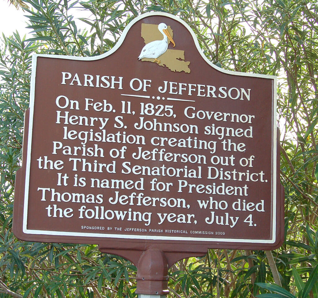 This marker commemorates the establishment of the Parish of Jefferson on February 11, 1825. It highlights that the parish was created through legislation signed by Governor Henry S. Johnson out of the Third Senatorial District. The marker also notes that Jefferson Parish was named in honor of President Thomas Jefferson, who passed away the following year on July 4, 1826. Its placement at the parish line serves as an informative welcome sign, providing a brief historical context to those entering Jefferson Parish