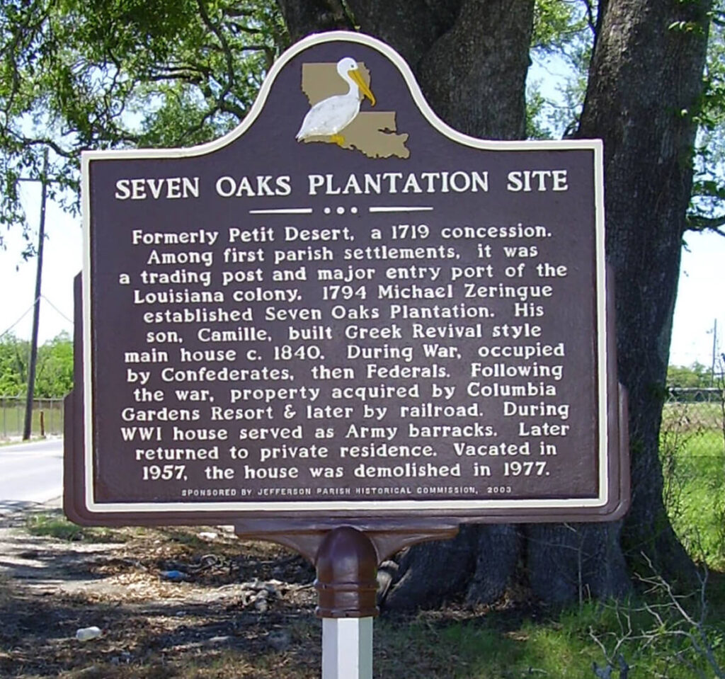 The marker commemorates the site of the Seven Oaks Plantation, which was formerly known as Petit Desert, a 1719 concession. It was among the first parish settlements, serving as a trading post and major entry port of the Louisiana colony. In 1794, Michael Zeringue established Seven Oaks Plantation. His son, Camille, built the Greek Revival style main house around 1840. During the Civil War, the plantation was occupied by Confederate and then Federal forces. After the war, the property was acquired by Columbia Gardens Resort and later by the railroad. During World War I, the house served as Army barracks. It was later returned to a private residence but was vacated in 1957 and demolished in 1977.
